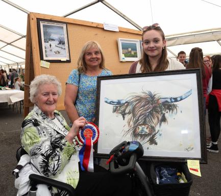 6 - Cathy Hawkes, right, pictured with her sister, Claire Hawkes Leonard's exhibit, winner in the painting and drawing class at Omagh Show. Also in the photograph are her mum, Amanda Hawkes and grandmother, Lilly Hawkes.