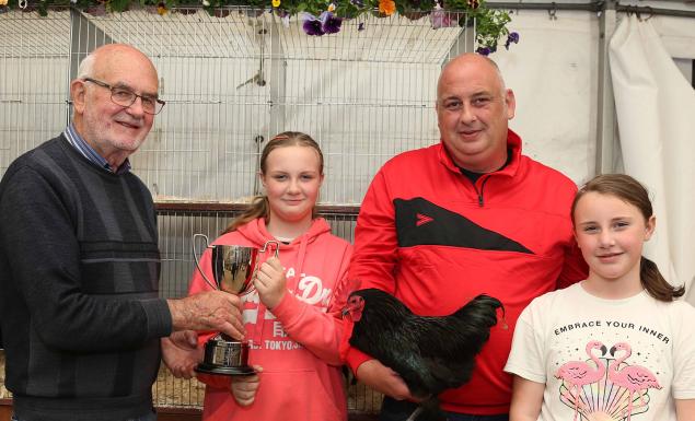7 - Albert Wylie presenting the Wylie Cup for the Champion Juvenile in the poultry section, a German Langahan, to Ellie Hurst as her dad, Geoff, and sister, Katie, look on.