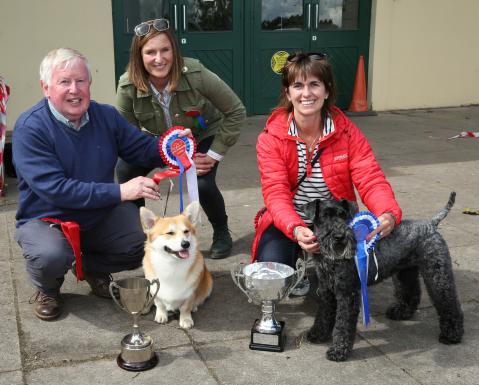 8 - Robin Bruce, Bready, and Welsh Corgi Pembrooke 'Marshall', left, winners of the working dog class and best in show while reserve best in show was Kerry Blue Terrier 'Darcy' and Karen Atchison, Omagh, during the dog show at Omagh Show. Also in the photograph is dog behaviourst, Elaine Power, who judged the popular event.