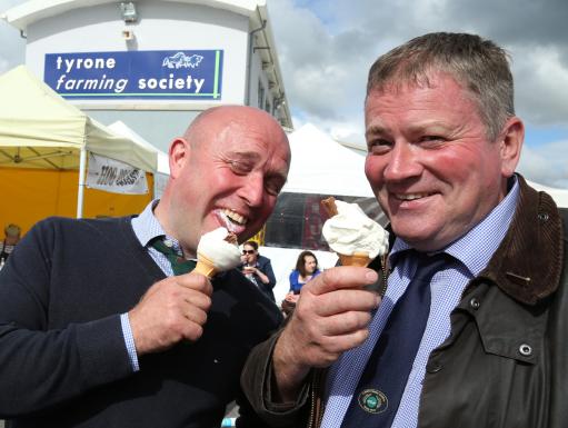 1 - William Crawford and Trevor Alcorn enjoy an ice cream following a busy day in the cattle field at Omagh Show.
