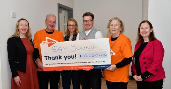 OMAGH author Sam Young has presented a cheque for £10,000 to the MS Society, with the donation directed specifically to the MS Research Hub at Queen’s University Belfast.